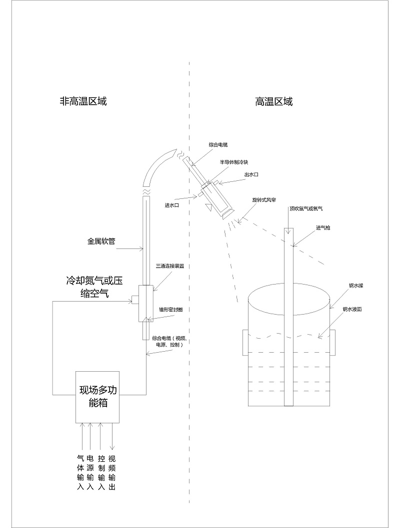 公司自主研發(fā)生產(chǎn)的轉(zhuǎn)爐爐口高溫針孔防濺除塵監(jiān)控系統(tǒng)主要是在轉(zhuǎn)爐狗窩處的側(cè)面外層圍板處開孔,將鏡頭伸入。采用微氣量保護方式, 集視頻技術(shù)、機電控制技術(shù)及傳感技術(shù)為一體的特種監(jiān)控成像技術(shù),將煉鋼時轉(zhuǎn)爐內(nèi)化學(xué)反應(yīng)的狀況顯現(xiàn)在操作人員面前。